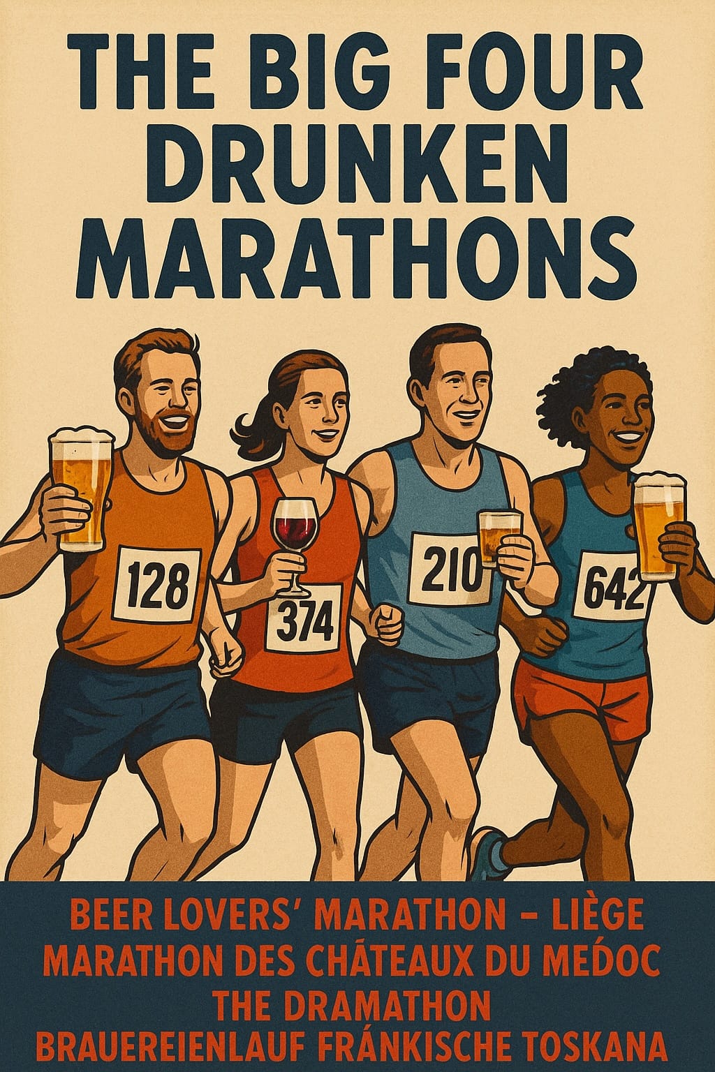 Einige Jahre nach gemeinsamen Marathons – begleitet von Kniebeschwerden – entstand die Idee: Wenn schon Marathon, dann mit Stil, Genuss und vielleicht auch einem leichten Schwips. So wurde The Drunken Four geboren – eine Laufserie für Genießer, die sich nicht zwischen Training und Tresen entscheiden wollen.